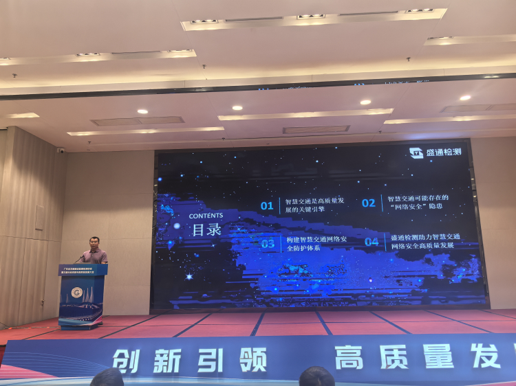 此次大會聚焦交通建設(shè)監(jiān)理檢測行業(yè)創(chuàng)新與高質(zhì)量發(fā)展,匯聚廣東省交通運(yùn)輸廳及相關(guān)部門領(lǐng)導(dǎo)、廣東省交通建設(shè)監(jiān)理檢測協(xié)會及會員單位負(fù)責(zé)人與技術(shù)骨干等。盛通檢測副總經(jīng)理、建筑智能化正高級工程師游才文受邀出席,圍繞《構(gòu)建智慧交通網(wǎng)絡(luò)安全防護(hù)體系,筑牢高質(zhì)量發(fā)展安全基礎(chǔ)》作主題分享,為行業(yè)安全發(fā)展建言獻(xiàn)策。